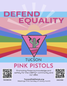 The Tucson Pink Pistols teaches queers to shoot and lets the public know that we are doing so. We believe that confidence and competence with firearms can enhance not just the personal safety of queer and trans individuals, but also our collective safety. Too often, we are perceived as easy targets for violence and hateful acts. No more. We are strong. We will fight back in our own defense. We will not allow ourselves to be easy marks for those seeking to harm us or deprive us of our equality and our rights. Armed queers don’t get bashed.